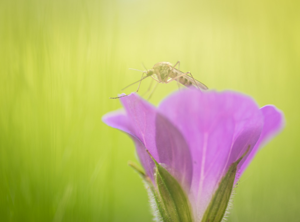 En bild på sommarens "stora" plåga - myggan!På bilden sittandes i solljuset på en skogsnäva/midsommarblomster...