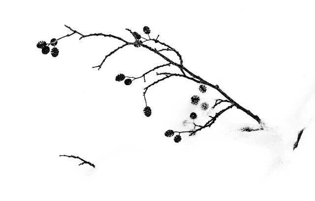 I den kritvita snön ligger en kvist från ett alträd begravd. På något sätt framträder den så fint mot den vita snön att jag inte kunde låta bli att göra en bild på den. Skogens alla små detaljer är verkligen helt fantastiska att studera lite närmare, det gäller bara att ge sig tid att hitta dessa vackra detaljer...