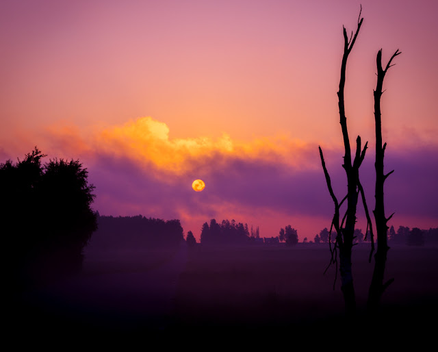 En bild från en sådan där fantastisk och stilla försommarmorgon då dimmorna ligger täta över landskapen och solen blir som en gyllene boll på himlen. Jag älskar verkligen den här tiden på dygnet då det blå ljuset möter det guldfärgade och den fantastiska stillheten som då infinner sig. När allt vaknar och nattens mörker långsamt förvandlas till dag...