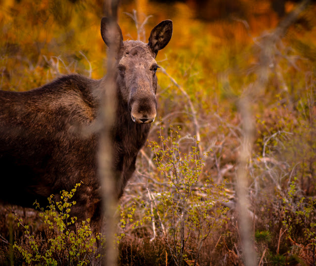 En bild från ett nära och fint älgmöte i den sprudlande vårskogen. Den här älgen tittar nyfiket på fotografen som inte kan låta bli att göra sina bilder på detta ståtliga djur. Vi blir stående båda två en tid innan älgen bestämmer sig för att bege sig djupare in i skogen. Kvar står jag fylld av glädje efter ett så vackert älgmöte...